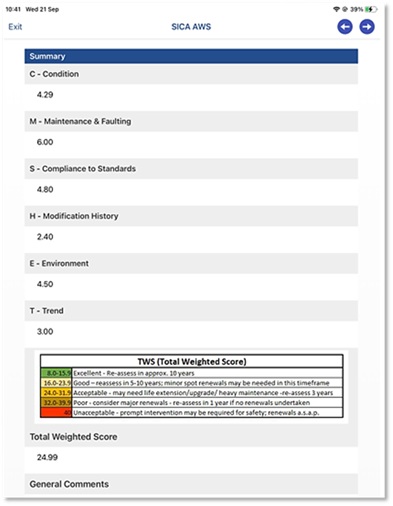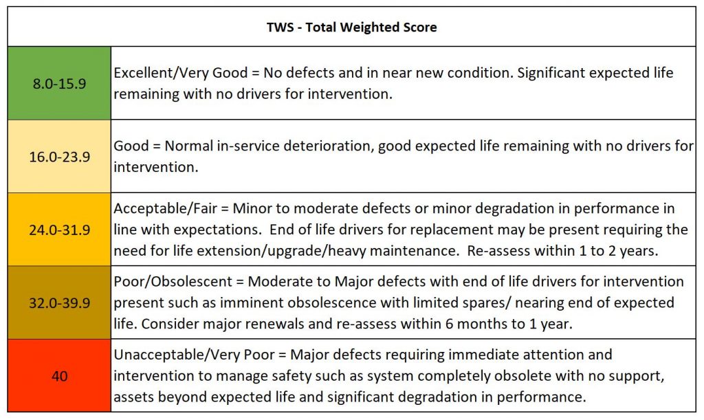 The individual scores captured against the questions within each of the above categories roll up into a Total Weighted Score which is designed to give an overall assessment of asset condition based on the following ranges: